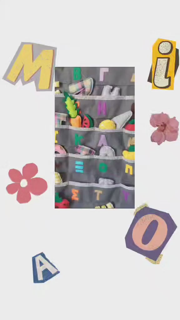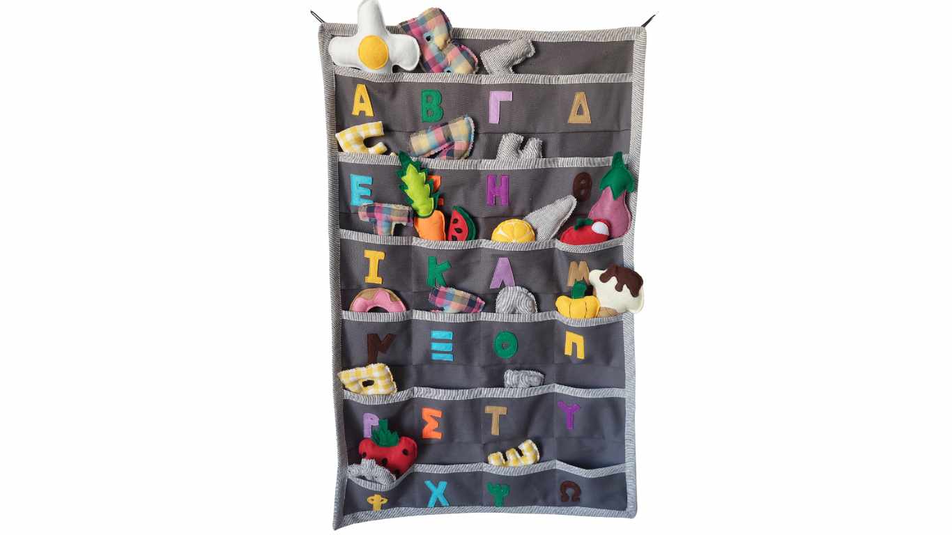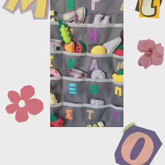 Απαραίτητο υλικό για κάθε τμήμα το αλφάβητο όπως δεν το έχετε ξαναδεί . Θέλετε το παιδί να μάθει γρήγορα και εύκολα το αλφάβητο ? Τότε σας έχουμε την λύση . Υφασμάτινος πίνακας με θήκες , σε κάθε θήκη έχει το αλφάβητο και ένα αντικείμενο ή φρούτο ή λαχανικό το οποίο ξεκινά με το κάθε γράμμα . Σε ηλικίες 2-4 το παιχνίδι μπορεί να ξεκινήσει με τα φρούτα και τα λαχανικά ενώ σε μεγαλύτερες 4-6 τα παιδιά ψάχνουν να βρούνε τα ίδια τα γράμματα και τα τοποθετούν στην θήκη που ταιριάζει . Ο πίνακας περιλαμβάνει 24 γράμματα και 24 τσόχινα παιχνίδια που κουδουνίζουν (φρούτα, λαχανικά, αντικείμενα ) . H συσκευασία του πίνακα είναι το backpack της EDUFUN.